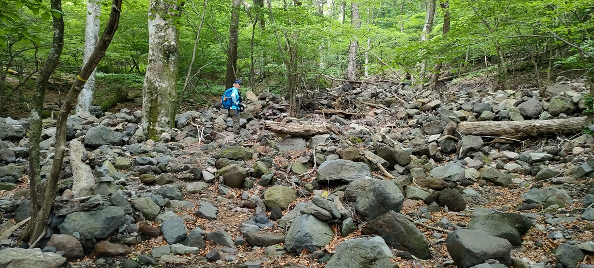 | ソババッケ〜大戸越(うとんこし)までの谷筋区間は涸沢特有の岩ゴロ道なので赤テープを見落とさず慎重に、、、 | ||||