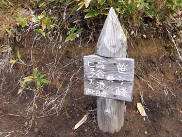 高谷池へは黒沢岳を左に巻いて進み笹道に出ると、焼山・影火打・火打山・三角屋根の