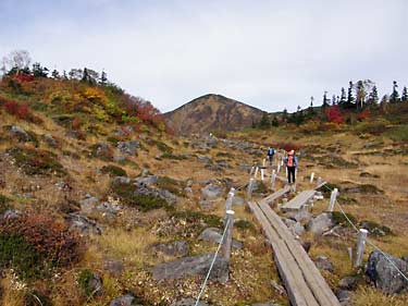 雷鳥平を尾根に沿って進みガレ場に作られた木道(急登)を登り切ると火打山山頂だ。