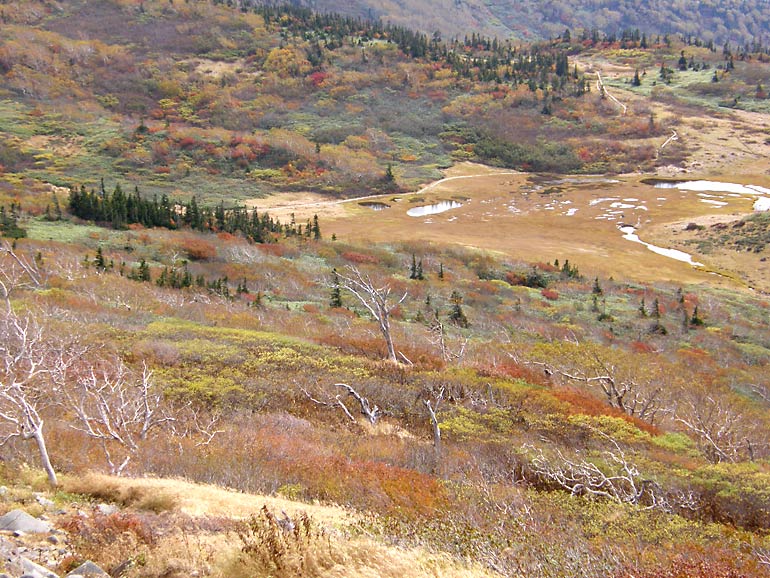 逆さ火打が写る「天狗ノ庭湿原」に出る。