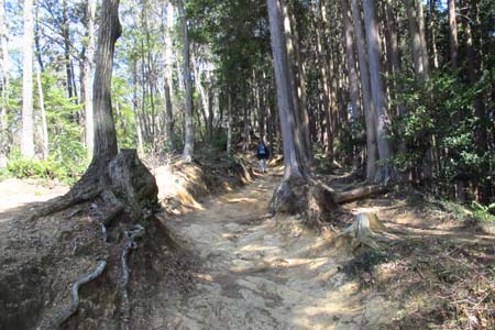 | 駒高集落から赤い指導標に従い物見山方面へ進む | 大勢のハイカーが訪れるせいか柔らかい部分が凹に。。。 | |||