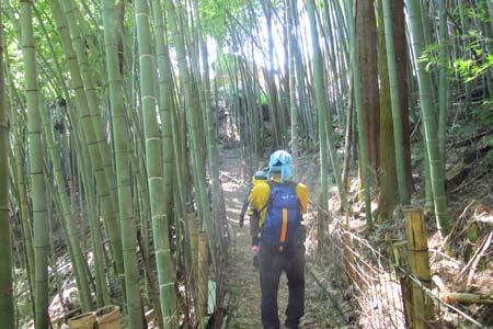 | 緩いアップダウンを2回ほどしたのち、↑竹藪に出ればユガテが近い | ||||