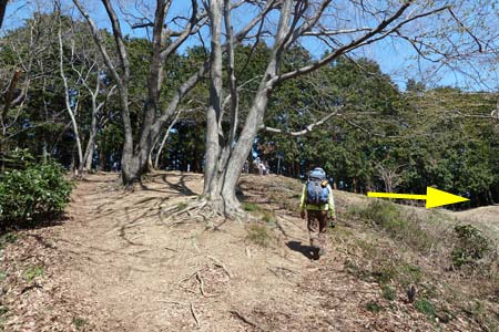 | 南斜面が広々とした物見山 一等三角点は矢印方向に約100Mほど進む |