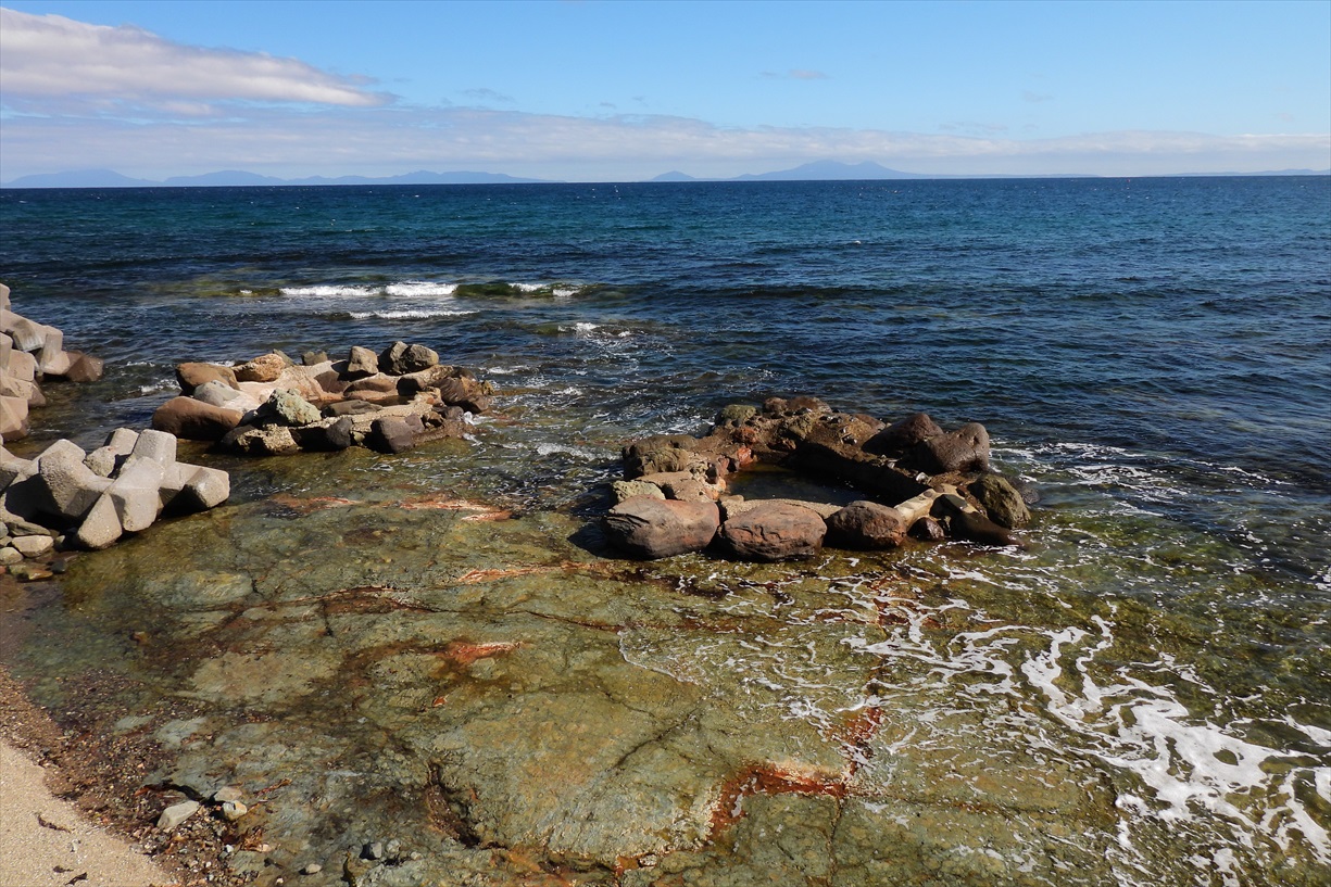 | 10/2 瀬石温泉 夏場の干潮時のみ入浴可 前方に見える島々は北方領土 | ||||