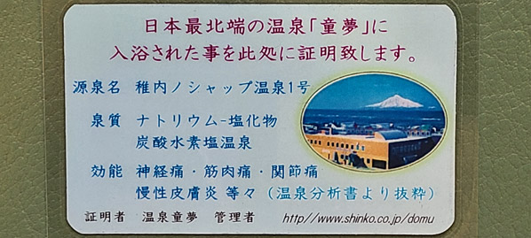 | 9/30 稚内温泉 童夢 TEL 0162-28-1160 泉質満足度☆☆☆ | ||||