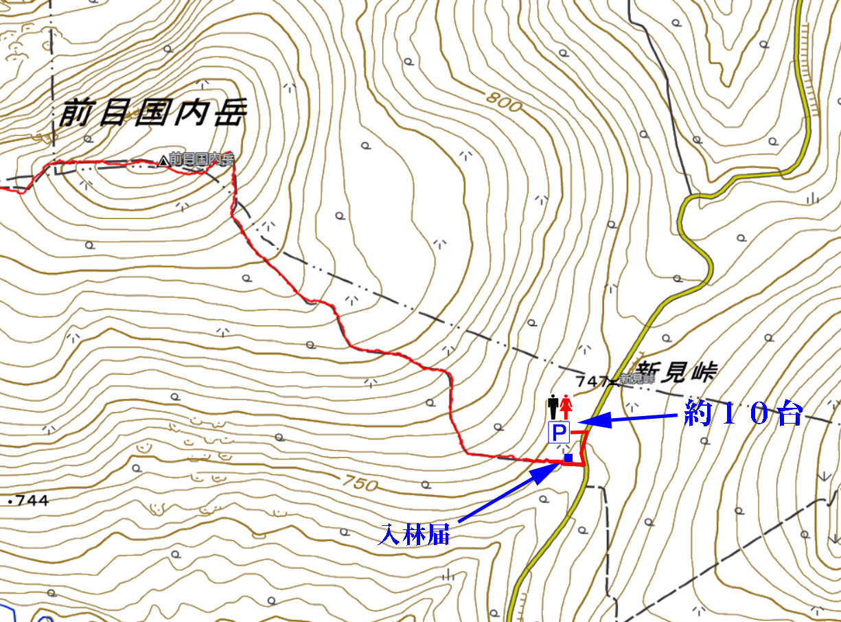 | am6:00 新見峠駐車場着(赤い屋根の三角建物=トイレ) am6:30出発 根曲り竹採りの車が多いので早めの到着必須 |