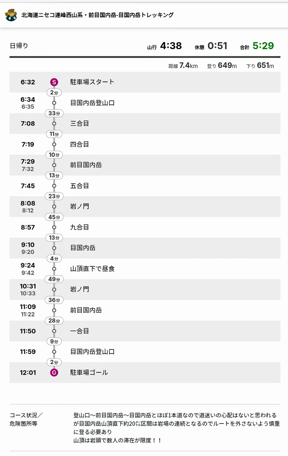 | 《目国内岳コースタイム他》 写真撮影時間20分〜100分含む |