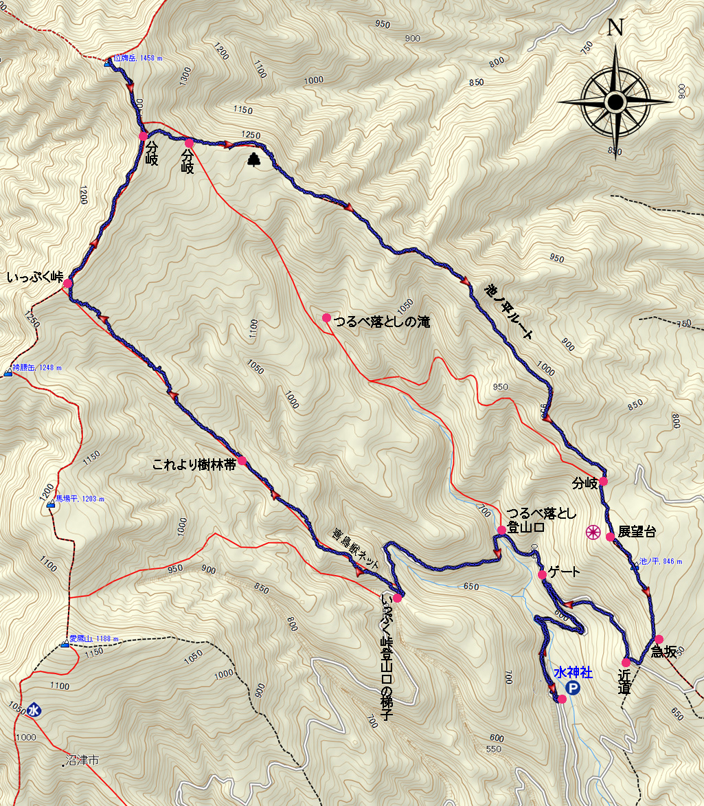 | (計曲線 50M 主曲線 10M) 水神社駐車場標高/526M 標高差/931.5M 累計標高/1065M 総歩行距離/12786M |