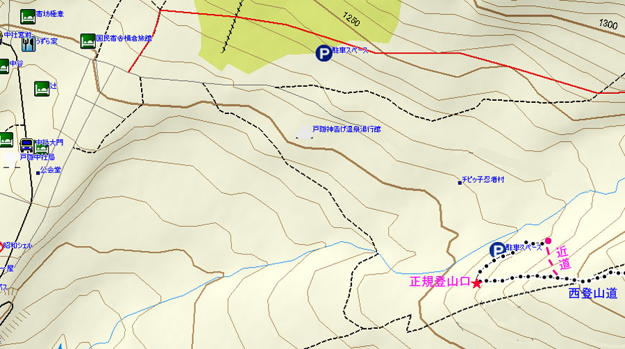 | 西登山道・登山口着 | ピンク囲み=近道登山口 | |||