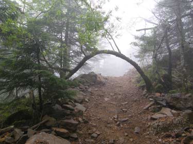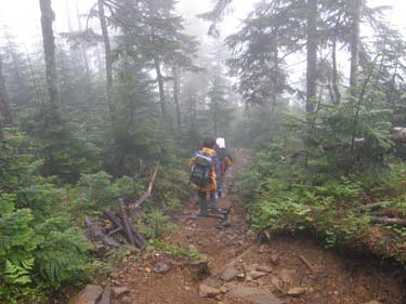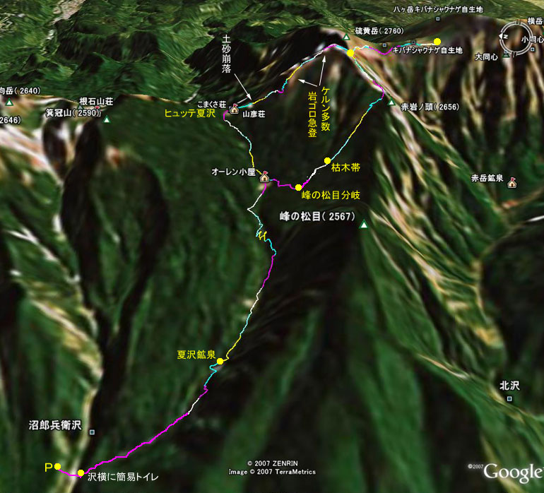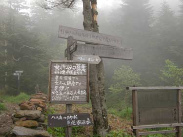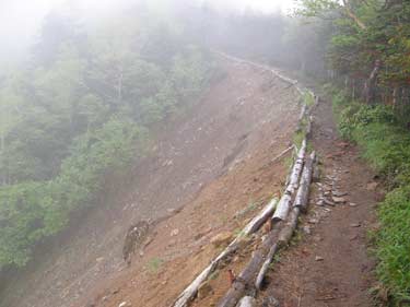 小屋からはひと歩きで夏沢峠(ヒュッテ夏沢)に出る。 峠から土砂崩落地帯を通過し森林限界を過ぎた辺り
