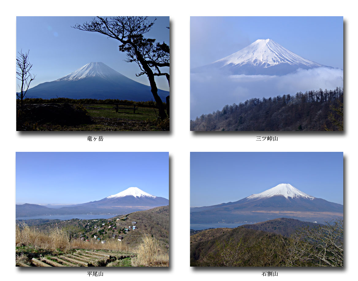 | 竜ヶ岳・三ツ峠山・石割山・平尾山の四山から望む富士山 | ||||