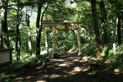 | 一の鎖を上って平坦地に出れば前方に鳥居と二の鎖小屋が見える | ||||