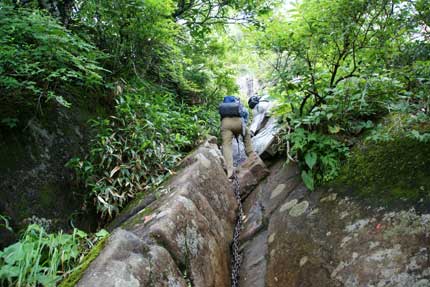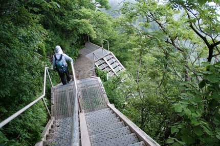 | 矢印/二の鎖を登りきると頭上に三の鎖が見える | 三の鎖へ向かう斉藤さん(香川県在住) | |||