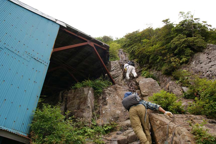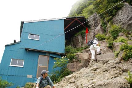 | 三の鎖・取り付き箇所でここは腕(足)試し編? | 三の鎖小屋 赤矢印・三の鎖 ここからが難関! | |||