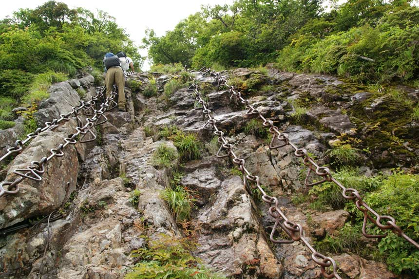 | 一の鎖 左右で上り下りを使い分けている。 モデルは松本市在住 せんちょうさん 一般登山用の鎖と違い信仰登山の鎖で輪が大きいうえ鎖一本の自重で遊びが殆どない超重量級な鎖 |