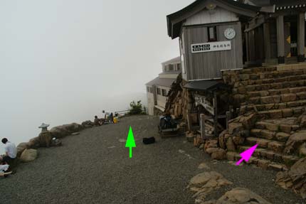 | 三の鎖を登りきるとそこは石鎚神社頂上社だった | 石鎚神社頂上社全景 緑矢印 三の鎖迂回路へ 赤矢印 三の鎖へ |