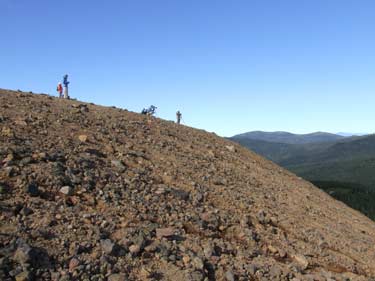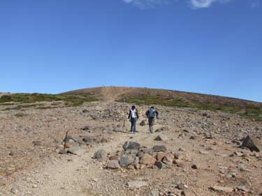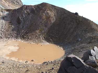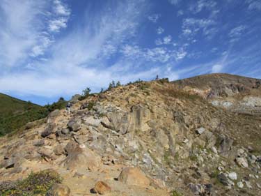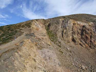 | 中腹火口縁のガレ場を登る | 中腹の噴火口 | |||