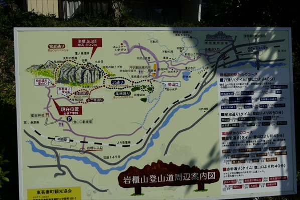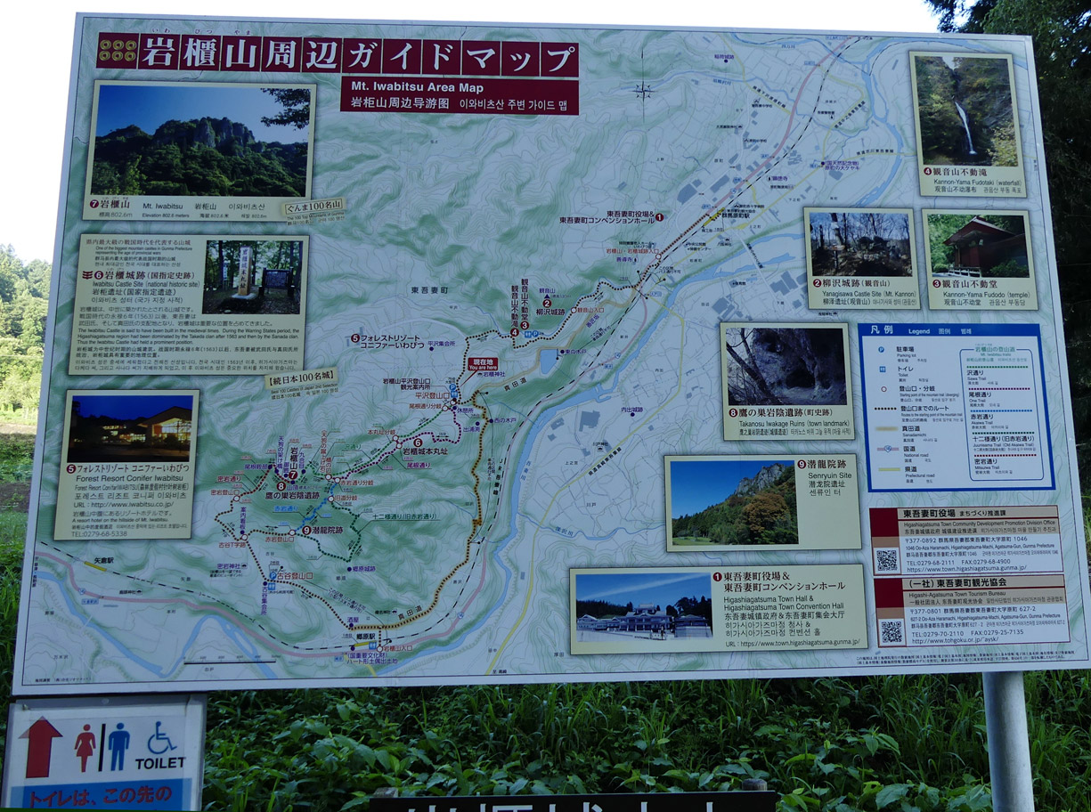 | 平沢登山口駐車場に設置された岩櫃山案内板 岩櫃山コースMAP&観光案内パンフは東吾妻町観光協会公式ホームページからDL可 |