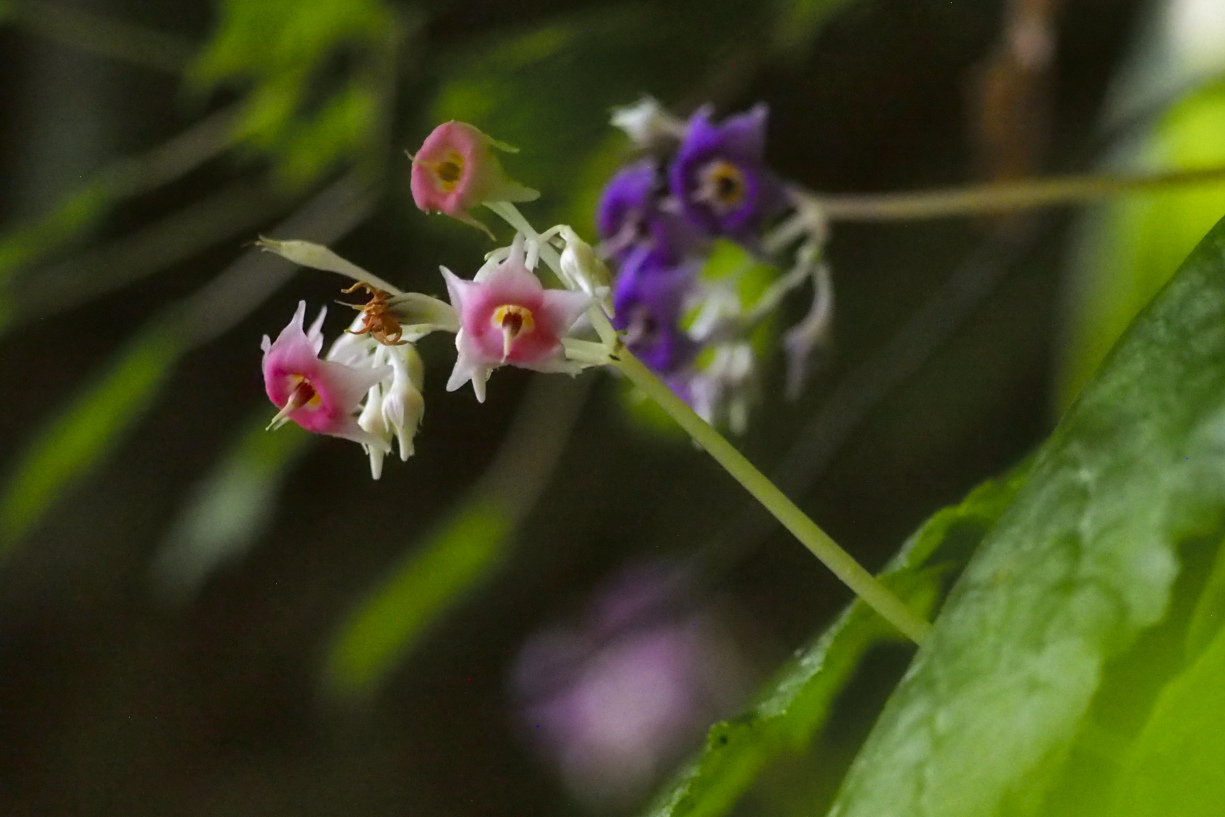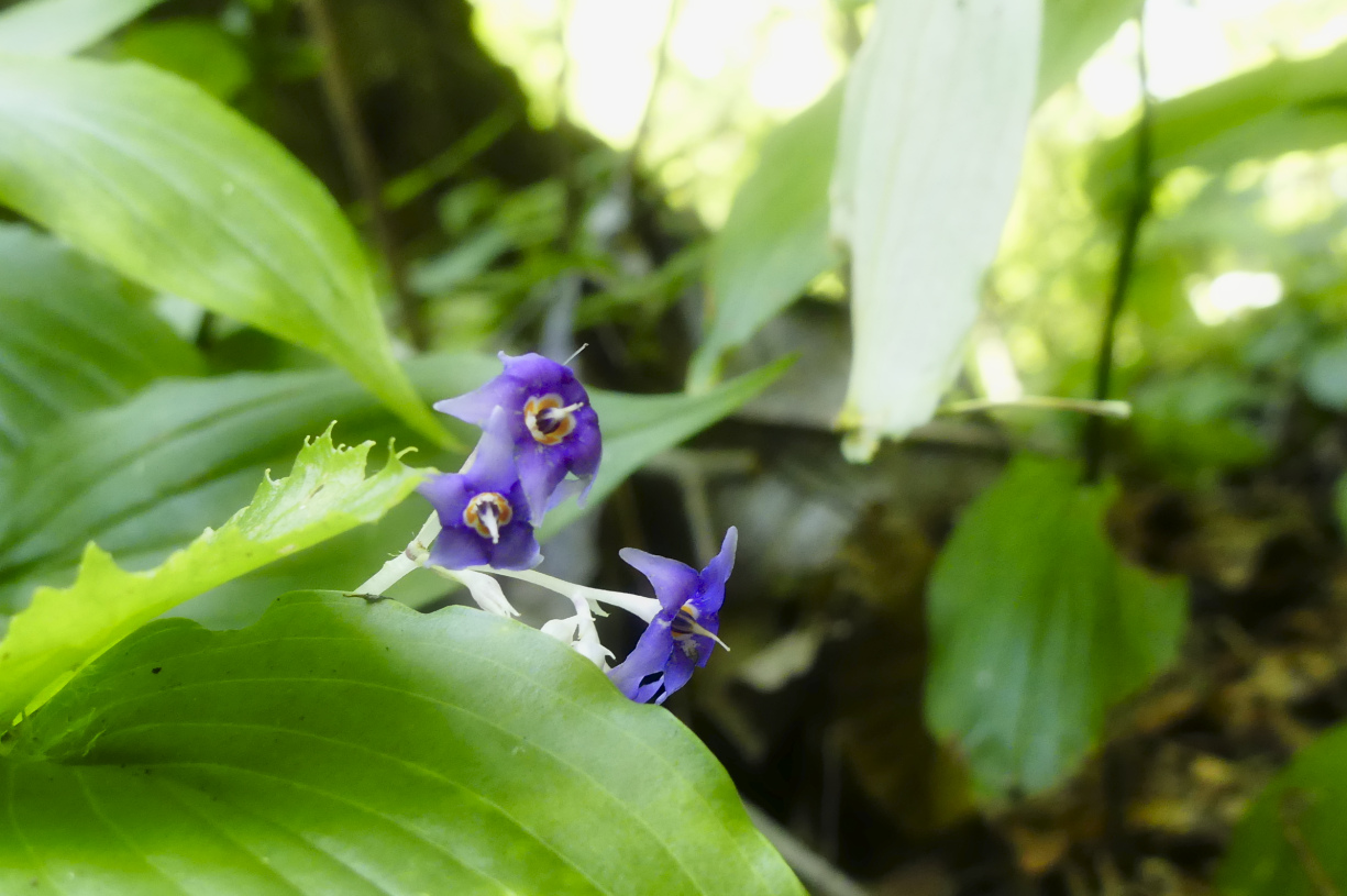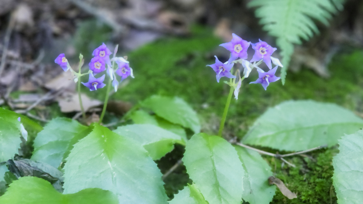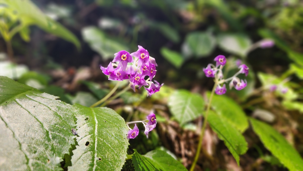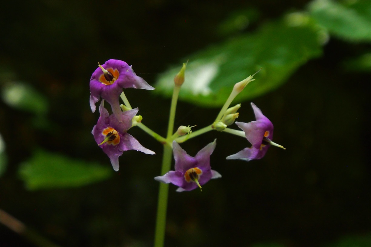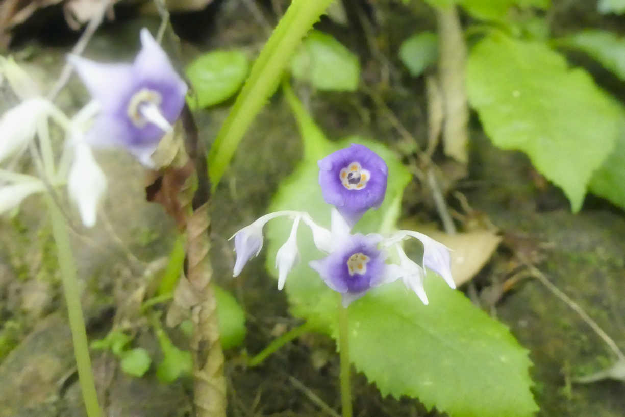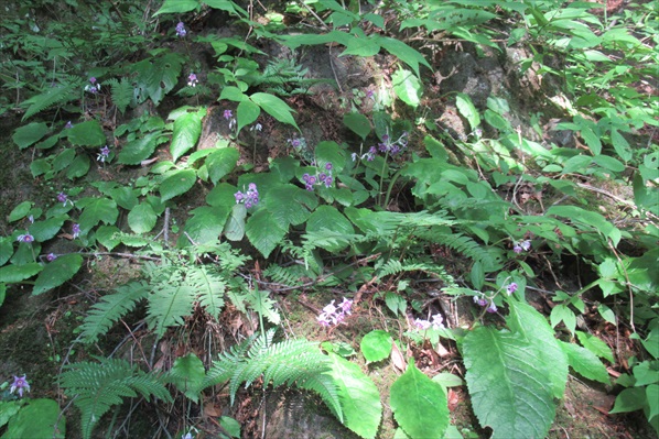 | イワタバコ・岩煙草 花言葉 《愛らしい心 ・ 涼しげ》 イワタバコは谷底のひんやりとした場所で咲くため「涼しげ」 小さな紫の花が集まっている様子が「愛らしい心」表現 イワタバコの葉はタバコに似た形をしている |