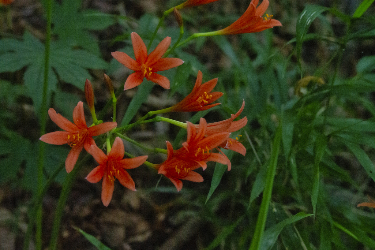 | キツネノカミソリ・狐の剃刀 花言葉 《妖艶》 夏の夜に林などで見かける濃いオレンジの花 華奢に伸びた茎や花弁なので色気を感じるので納得の花言葉 |