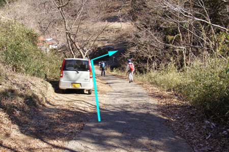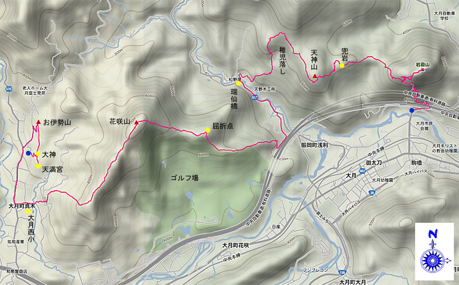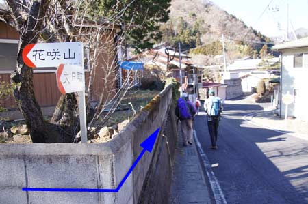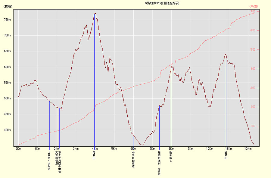 〜 大月西小学校入り口 9:16 〜 花咲山登山口 9:19 〜 車道出合い 9:23