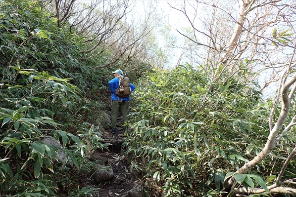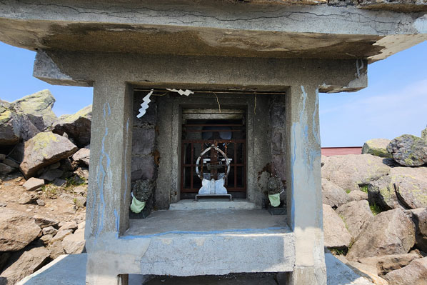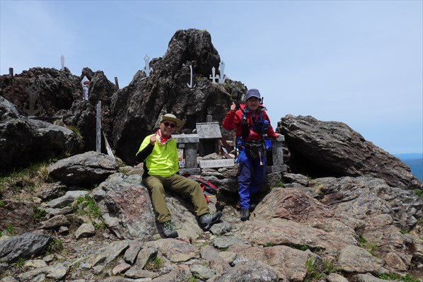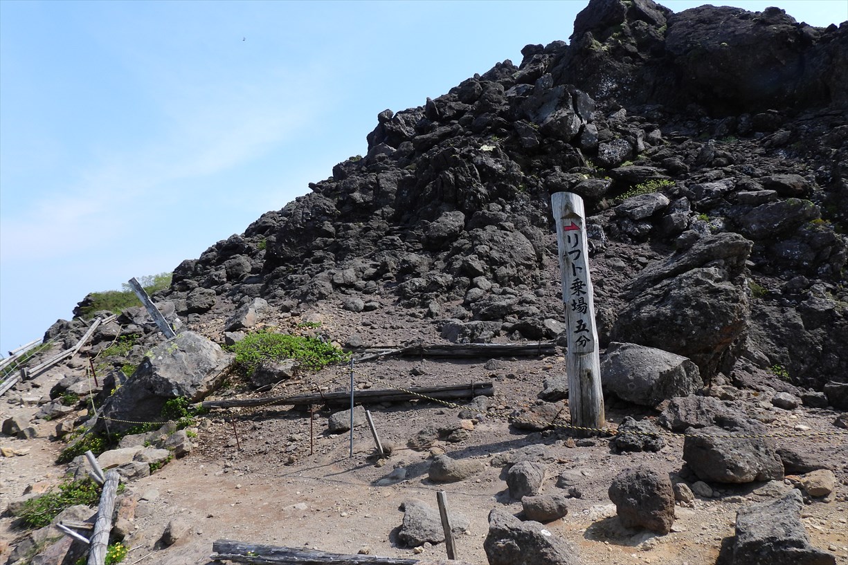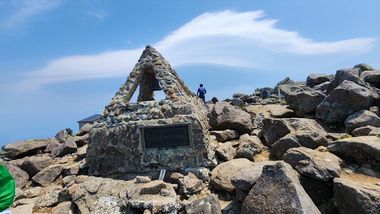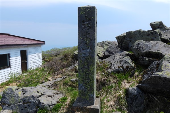 | 岩木山山頂 1624.7M ザック込みで70㌔超の爺でも吹き飛ばされそうな強風のためささっと退散です |