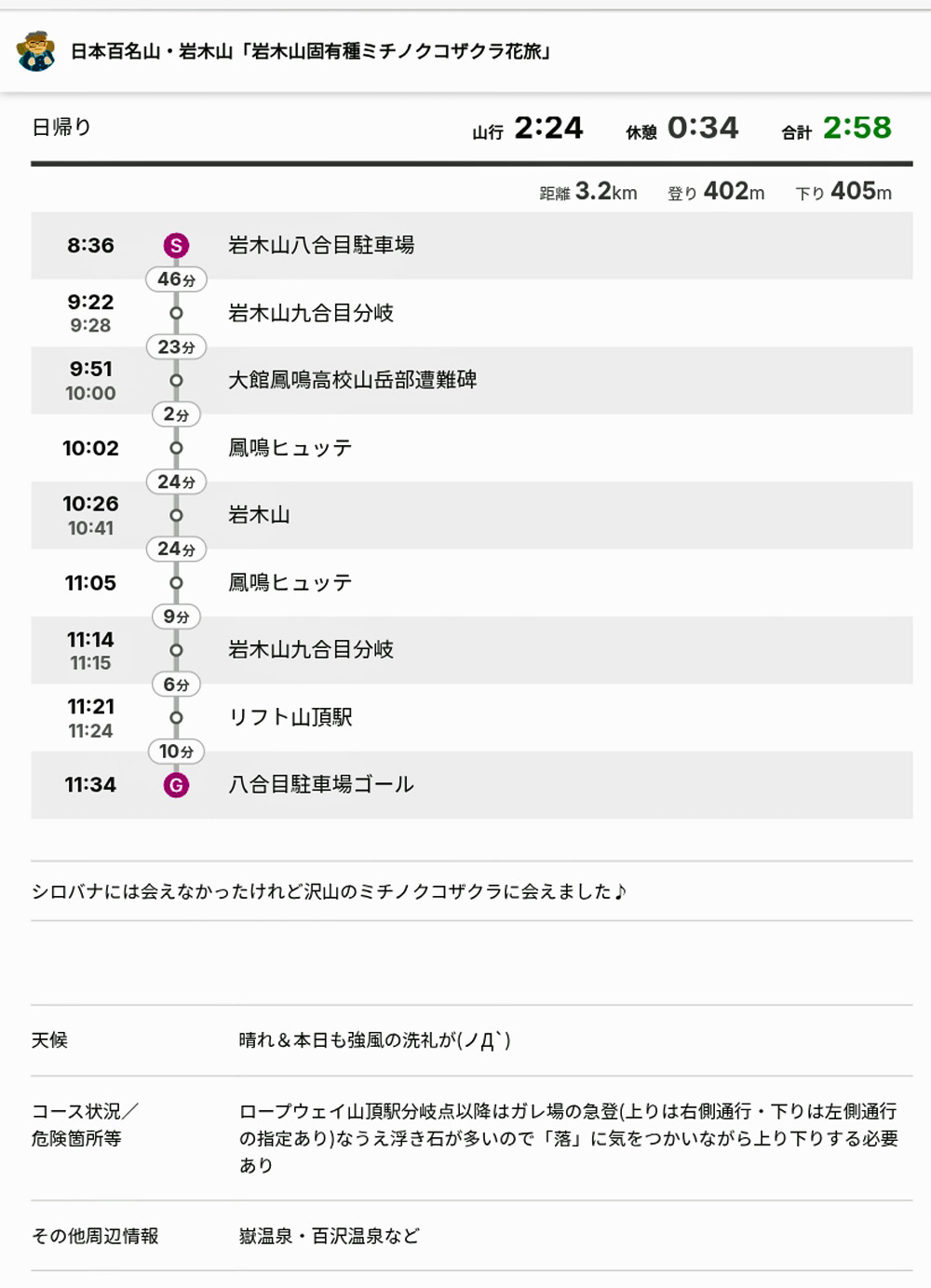 | 《岩木山ミチノクコザクラ花旅コースタイム他》 写真撮影時間20分~100分含む |