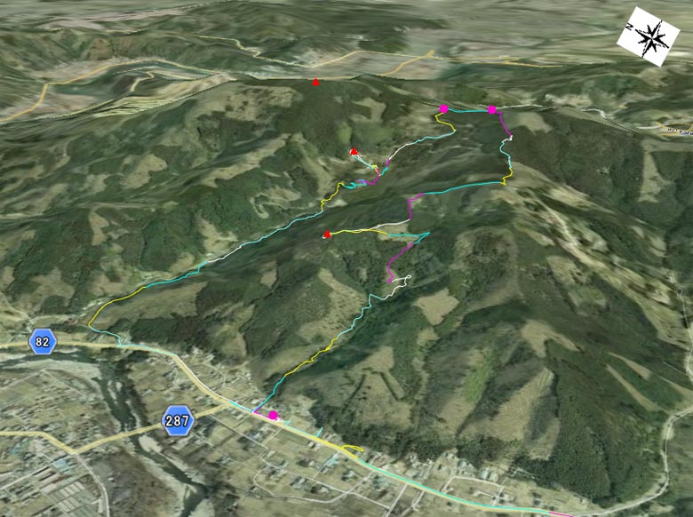 | (計曲線 50M 主曲線 10M) 最低標高/145.5M 最高標高/480M 標高差/325.5M 総歩行距離/8589M |