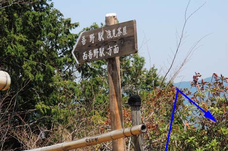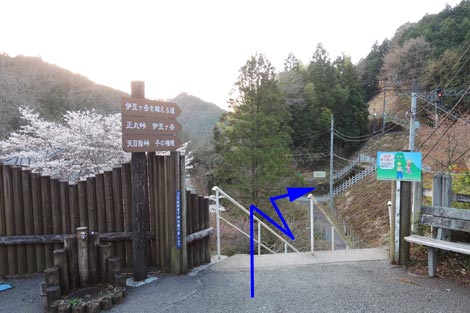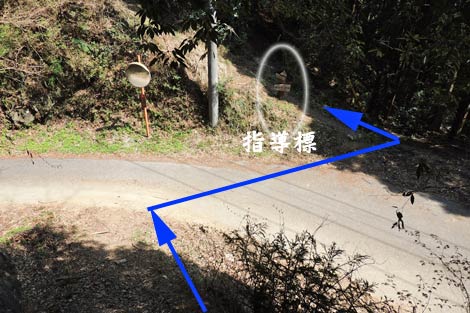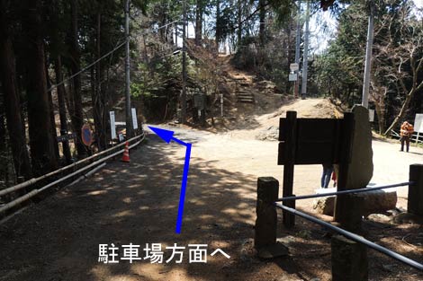| 子ノ権現・売店を通過後、大型バス駐車場方面へ | 駐車場下カーブ手前にあるこの指導標で右折 | |||