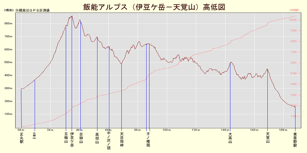 | 正丸駅P標高/300M 東吾野駅標高/130M 標高差/720.9M 総歩行距離/18804M | ||||