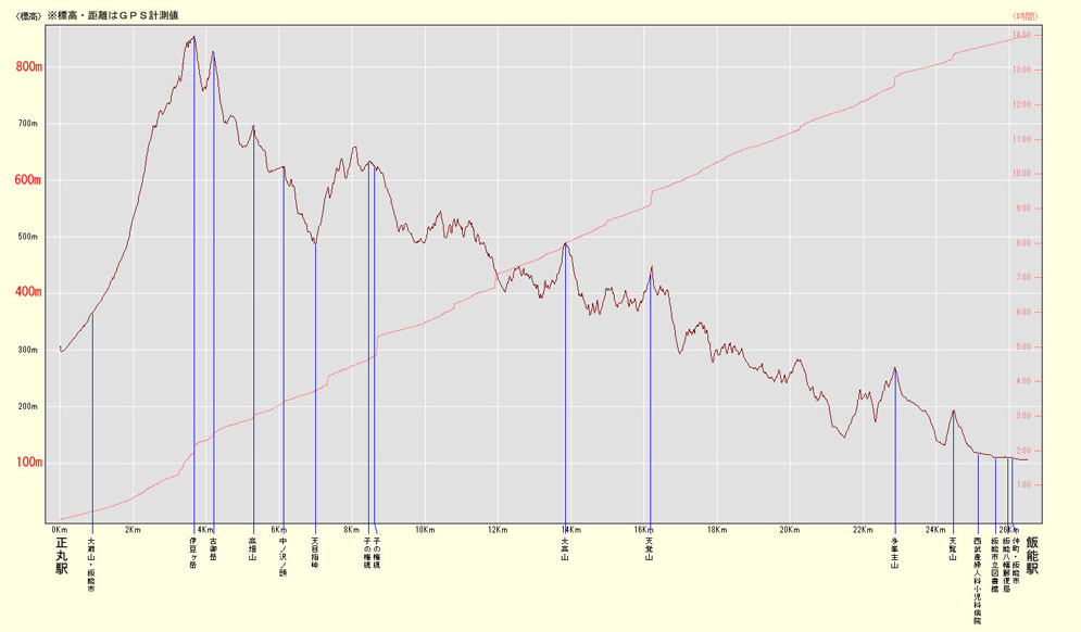 | 正丸駅標高/300M 飯能駅標高/106M 標高差/744.9M 総歩行距離/26505M | ||||