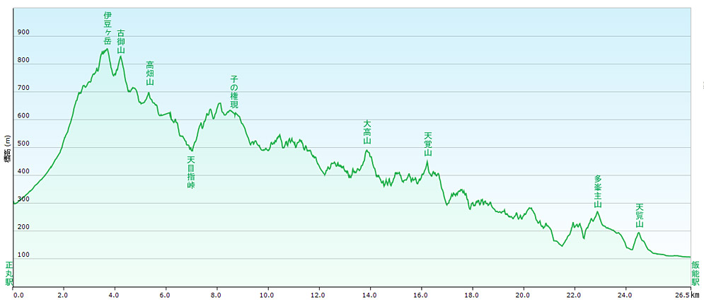 | 正丸駅標高/300M 飯能駅標高/106M 標高差/744.9M 総歩行距離/26505M | ||||