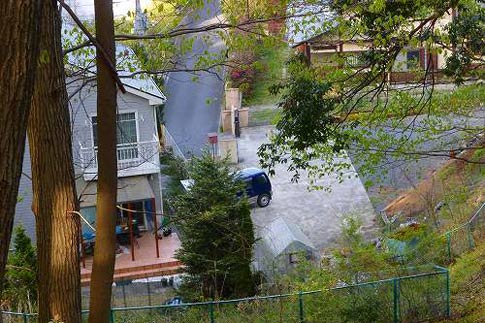 | 永田台通り 貯水池フェンス横から車道に出合う |