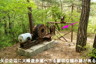 | 第二スキー場TOP・ロープトーの残骸 赤矢印近辺の踏み跡から大峰遊歩道へ |