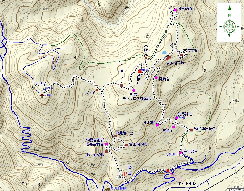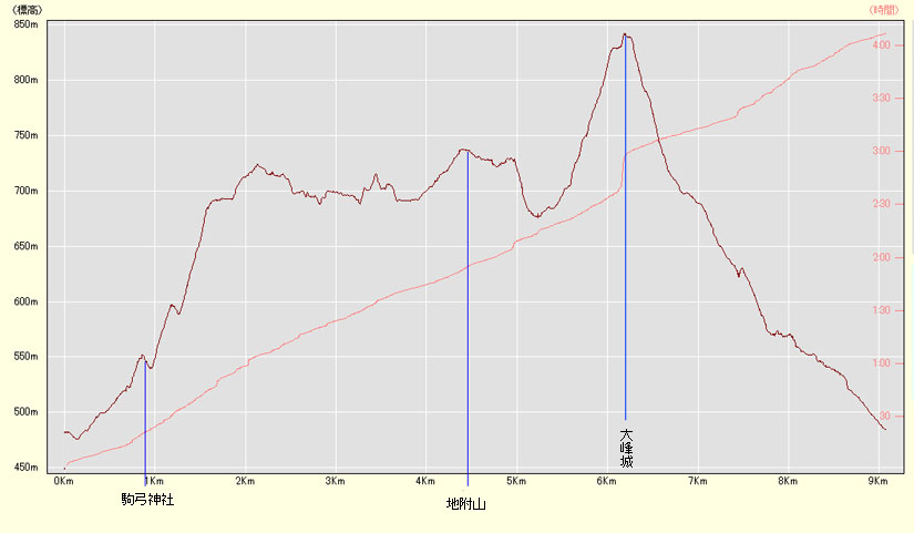 | (計曲線 50M 主曲線 10M) 駐車場標高/460M 大峰城/820M 標高差/360M 総歩行距離/9083M |