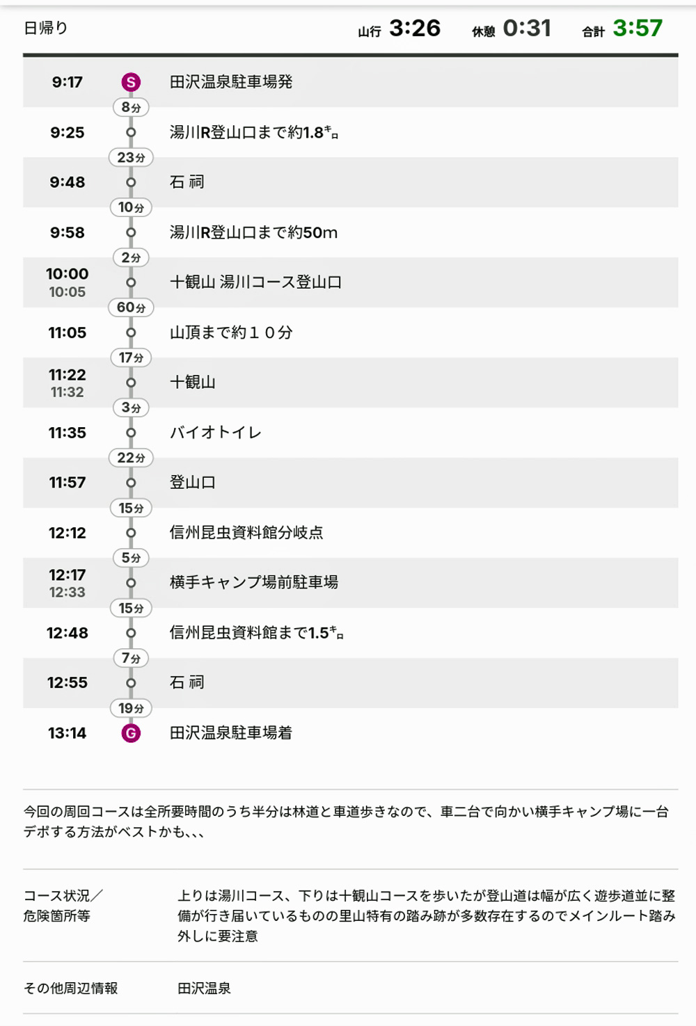 現地までの全行程&所要時間 長野発 6:30 〜 長野道工事渋滞 〜 田沢温泉駐車場着 9:00
