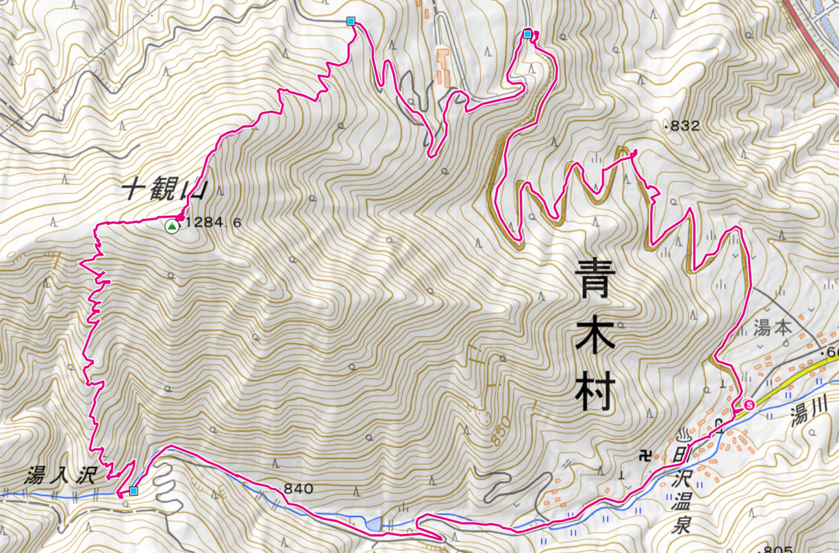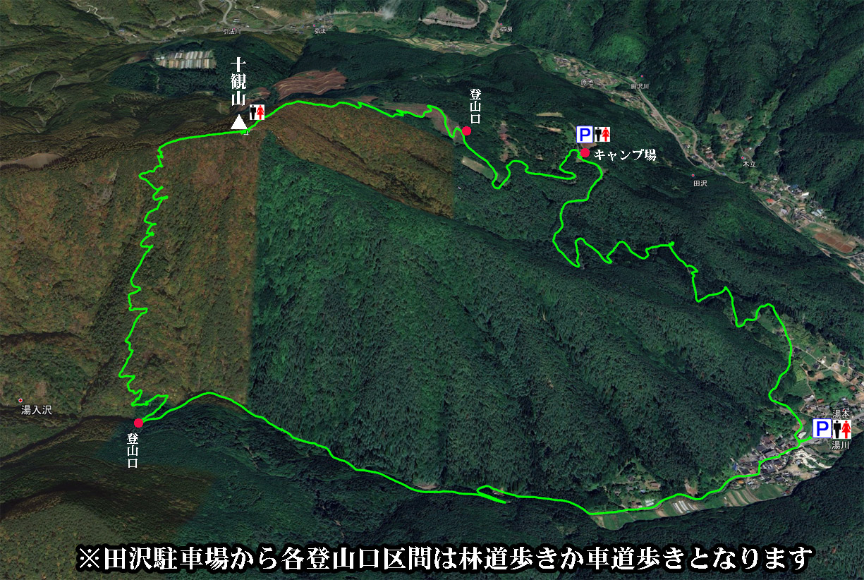 田沢温泉P〜林道歩き〜湯川R登山口〜十観山〜十観山R登山口〜横手キャンプ場〜車道歩き〜田沢温泉P