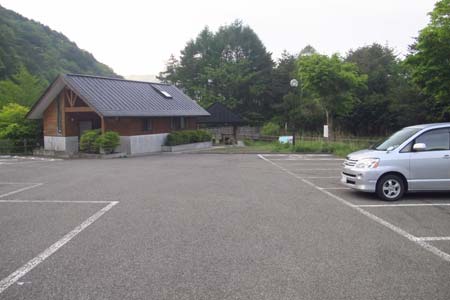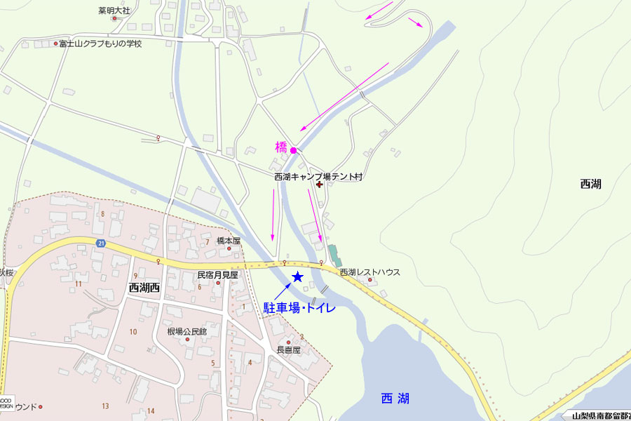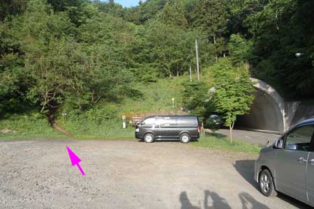 | 根場 駐車場&トイレ(ここで仮眠) | 文化洞トンネル横の駐車場 トンネル前方=西湖 写真後方=毛無山登山口バス停 |