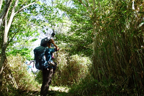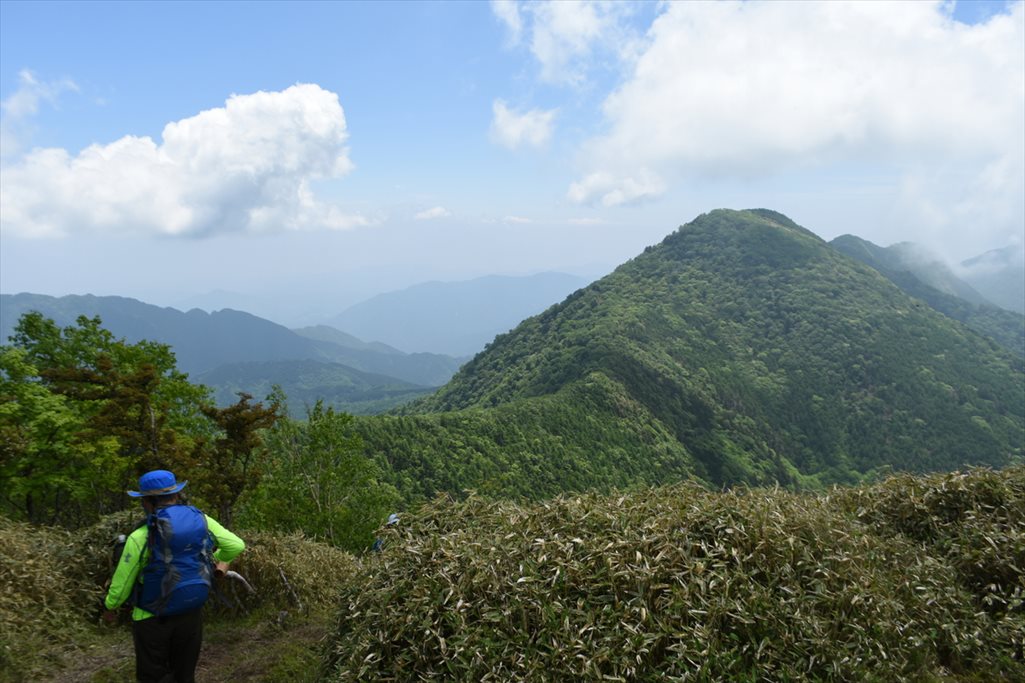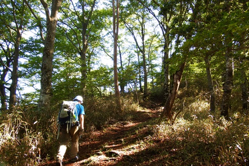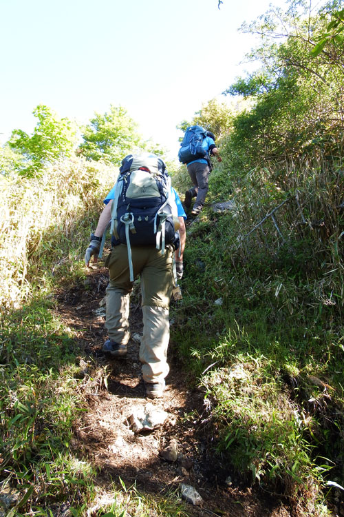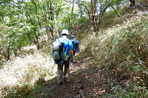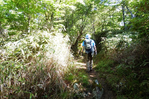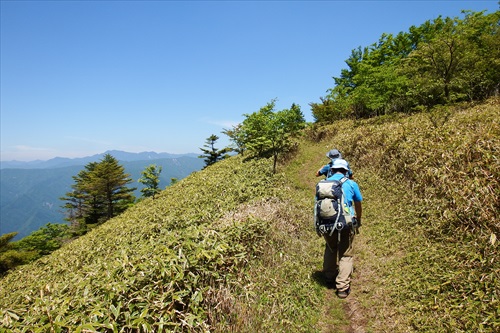 岩岳手前展望地は笹原の踏み跡を30bほど緩く下る |