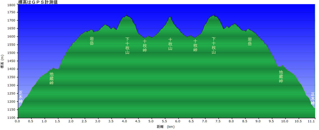 正木峠駐車場標高/1155m 標高差/577.4m 累積標高/1088m 総歩行距離/11087m |