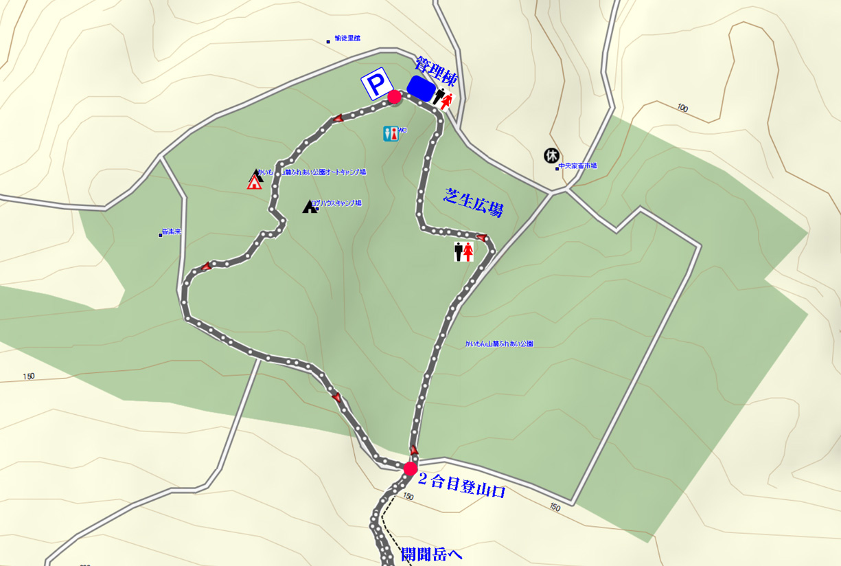 | 二合目登山口は芝生広場からが最短だが急坂なので下山時利用がオススメ | ||||