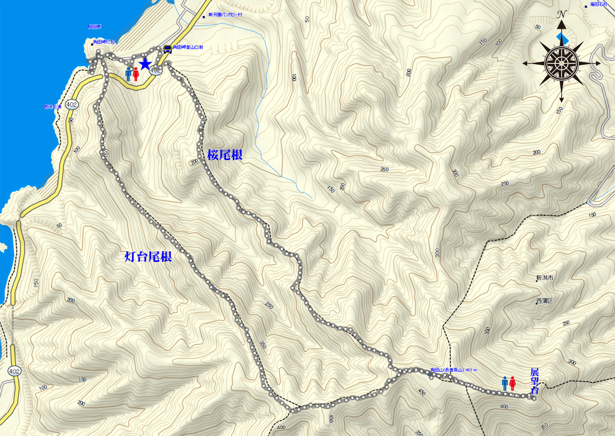 | 角田山ルート地図 (計曲線 50M 主曲線 10M) |