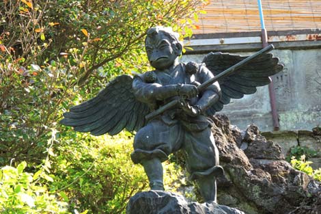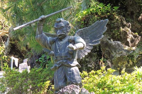 半僧坊本殿石段まわりにたつ烏天狗像/烏天狗というより田舎の腕白小僧って感じかな〜(笑) |