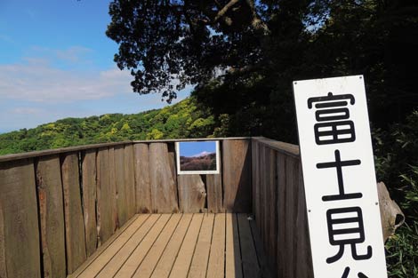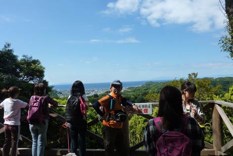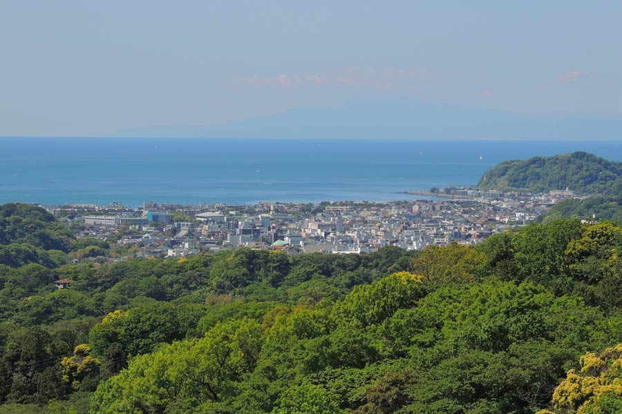 勝上献展望台より鎌倉市街と相模湾・由比ヶ浜、その奧左が大島、右に伊豆半島を望む |