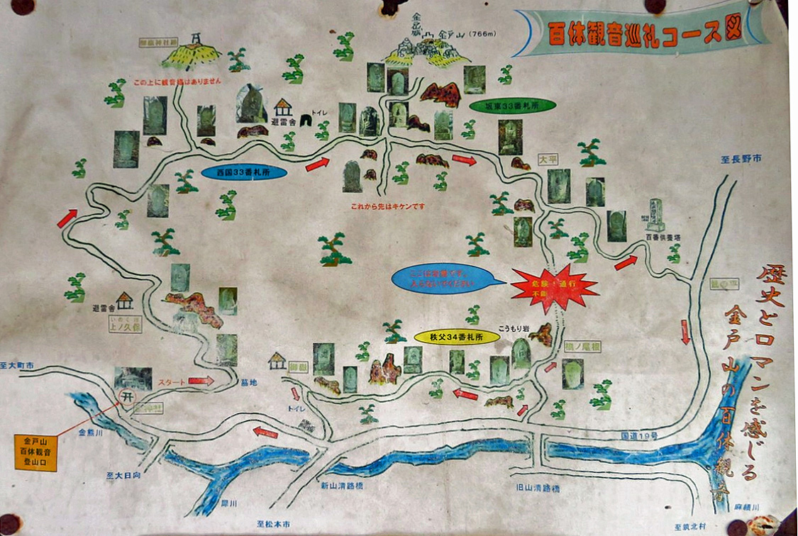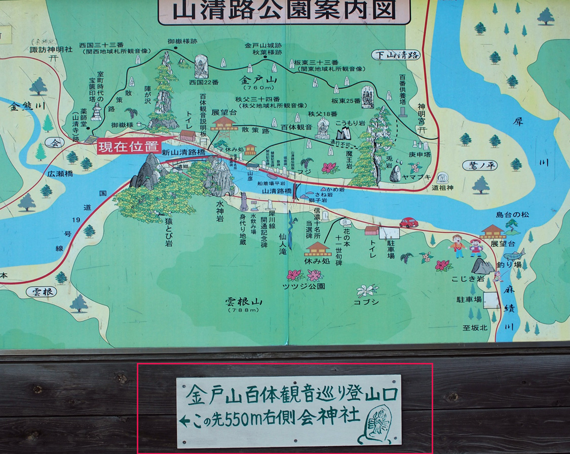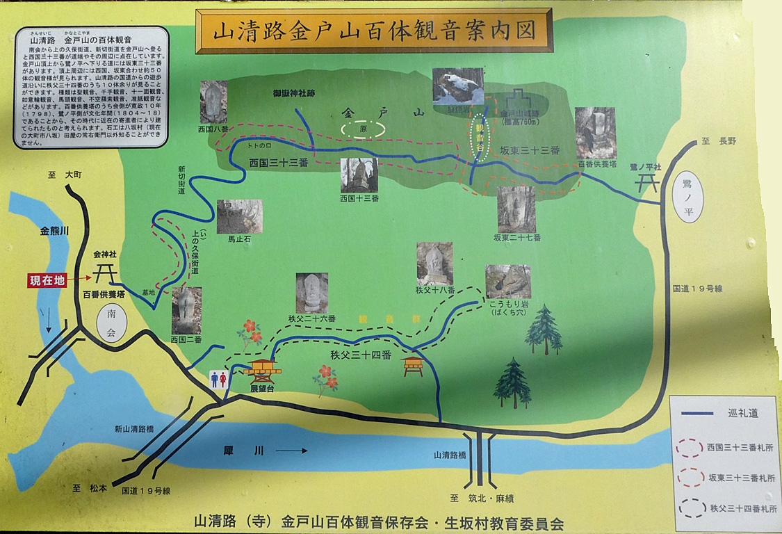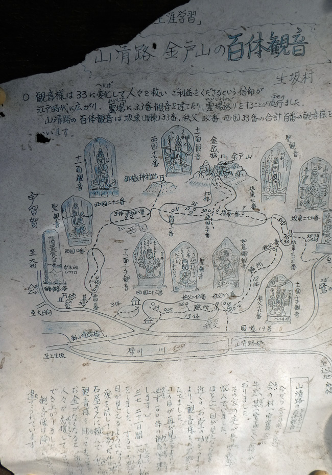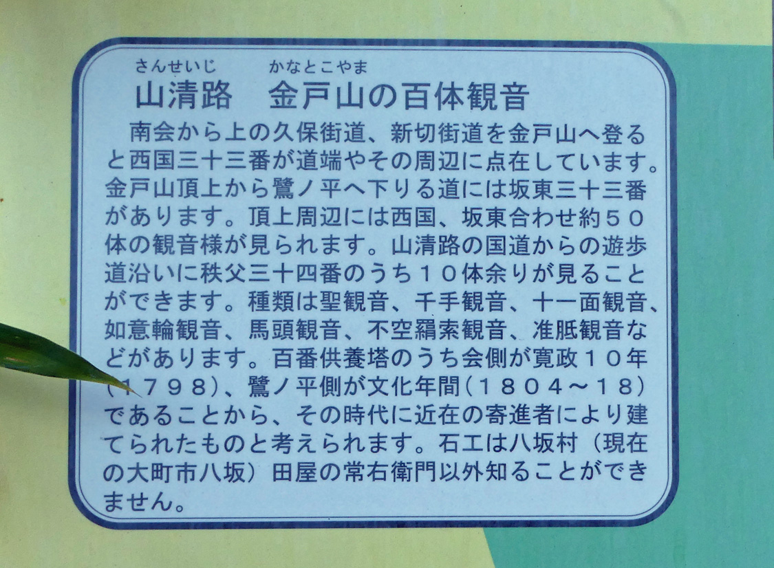 | 会神社駐車場に設置された金戸山100体観音案内板 | ||||