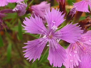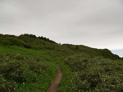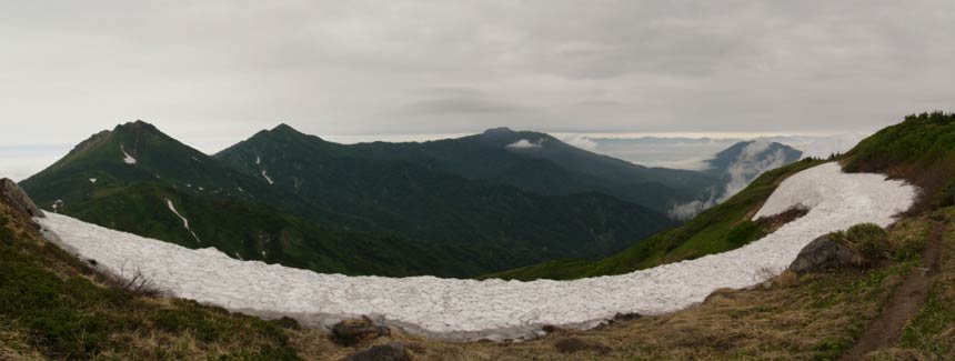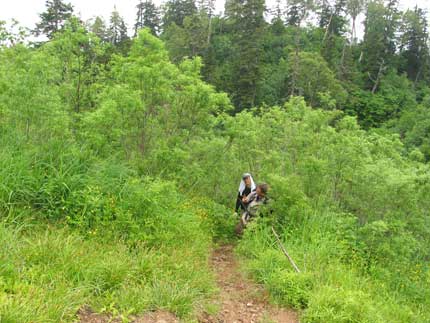 何回か上り返し、笹原の登山道を抜けると一面の草原にでる。 両脇に咲く花を眺めながら進むと天狗原