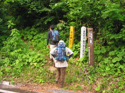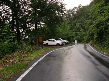右側に5〜7台の駐車スペースがあり、金山登山口は前方30m程先である。