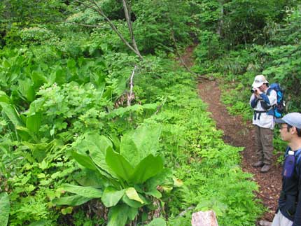 水場を過ぎてブナタテ尾根に取り付くとブナ林で保水力が良い為か、いたるところで水芭蕉の植生地帯を