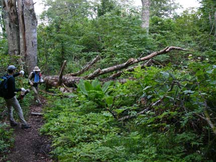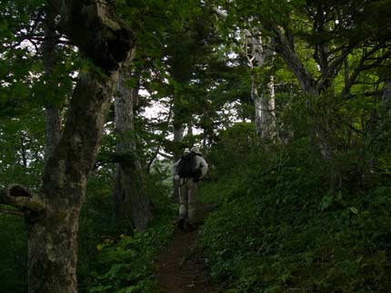 ブナの樹林帯をジグザグに登り、枯れた湿地帯を過ぎ左下から沢音が聞こえると間もなく水場にでる。
