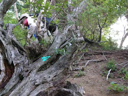 登山地図にはガレ場危険の書き込みがあり滑りやすい急斜面にはロープが張られている。